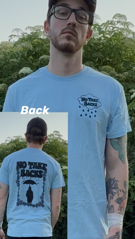 This light blue tee features the No Take Backs logo printed on the front chest inside a rainy cloud, capturing the reflective mood of the band’s sound. The back showcases a bold black graphic of a silhouetted figure holding an umbrella under falling raindrops, framed by hand-drawn flowers and the band’s name in striking, vintage-inspired lettering.